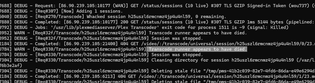 I can’t find anything on where the ffmpeg logs are stored, and if they are even stored at all. I think I might get more insight when I read the error reported before ffmpeg exits with code -9. Does anyone know this? I have no Plex Transcoder.log in my Logs folder, only Plex Transcoder Statistics.log. Would greatly appreciate your insights.