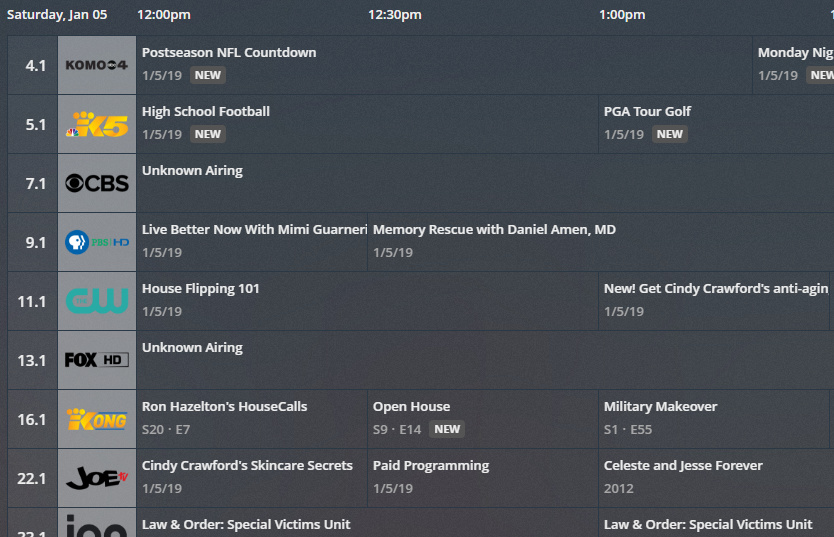 Note that channel 7.1 and 13.1 show unknown airing, If I refresh the guide data, they get fixed: