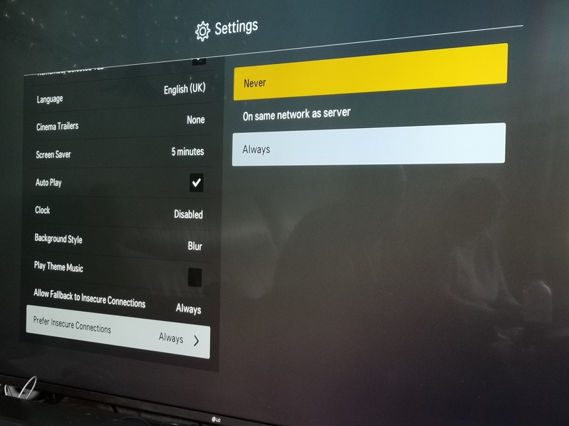 I have reconnected the tv to wifi, made sure both tv and app are up to date, changed my settings on the server to see if setting it to allow unsecure connections and still didnt work.