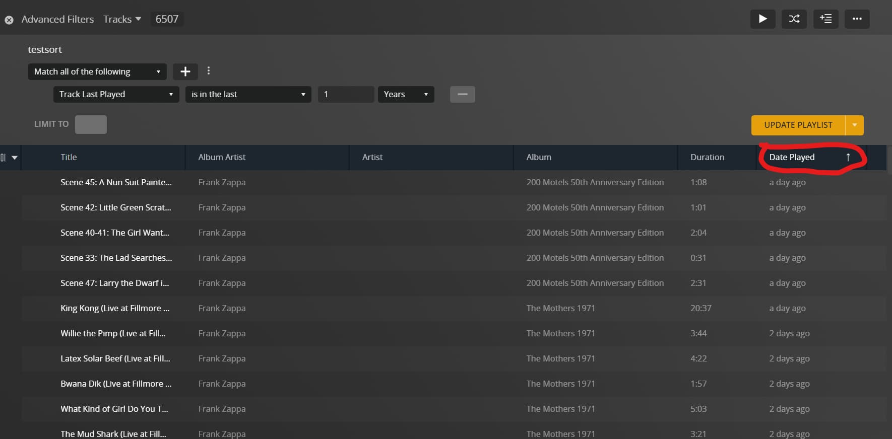 However, unlike viewing by ‘tracks’ where you can sort the list by title, date played, plays, etc, we cannot sort playlists at all.
