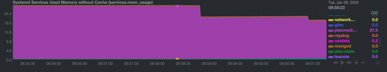 This morning, while I was asleep, plexmediaserver exploded in memory usage eating all system and paging memory available. Here’s a netdata screen shot: