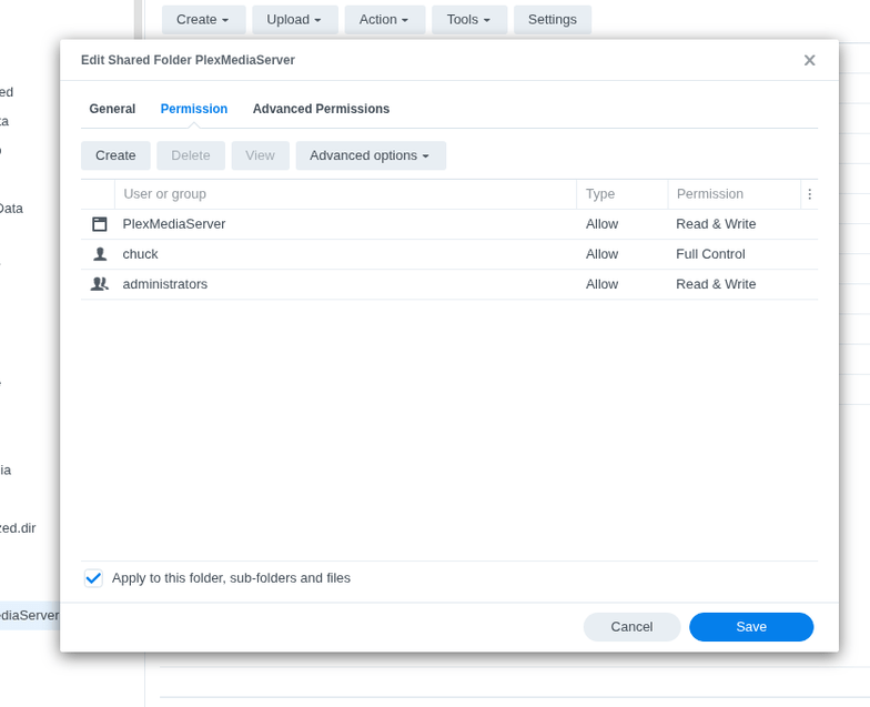 While DSM 7 manages the permission of the PlexMediaServer shared folder itself, it does not manage the permission of files placed inside.