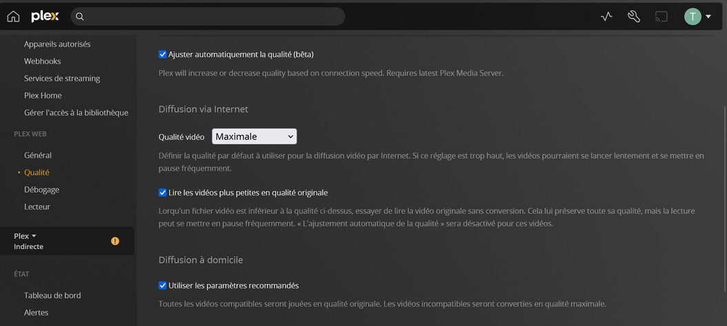 Indirect connections are limited to 1 Mbps (2 Mbps for Plex Pass members). If your stream goes into that category, it means your client considers the server to be remote and fails to establish a direct connection (which usually implies a problem in your remote access setup).