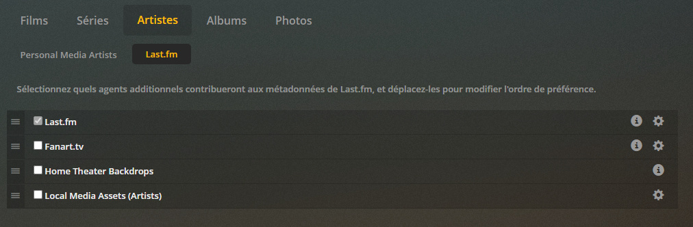 Sur mon Plex j’ai un soucis. Pour ma bibliothèque musical l’agent Lastfm ne fonctionne pas. Il ne récupère aucune infos concernant l’artiste. Je suis obligé de forcer la recherche pour associer l’artiste et ensuite il trouve les infos.