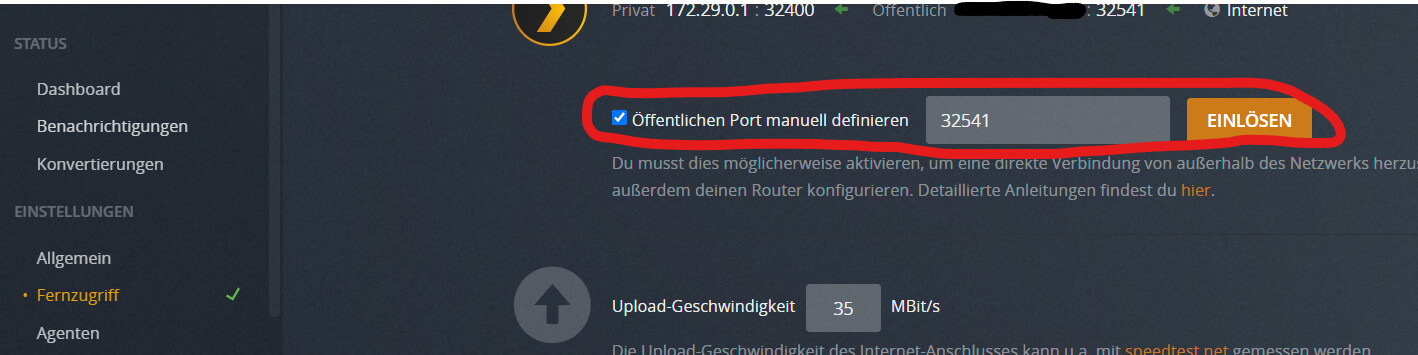 leider habe ich ein Problem mit meinem Fernzugriff. Bisher habe ich Plex nur zu Hause benutz und das funktioniert auch einwandfrei. Vor kurzem habe ich aber den Fernzugriff mit einer manuellen Portweiterleitung in der Fritzbox eingerichtet, damit ich auch in der Mittagspause meine Filme / Serien genießen kann. Ich habe auch schon den Beitrag von Plex zu bekannten Problemen abgearbeitet, aber das hat leider nix gebracht. Auch im Internet habe ich nichts gefunden, dass mein Problem löst. Solltet Ihr aber einen guten Beitrag haben, dann immer gerne her damit.