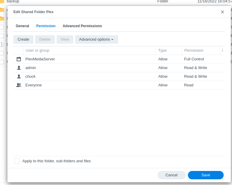 It’s of paramount importance that “PlexMediaServer” show as having Full Control of all files in the “Plex” shared folder before we start installing the DSM 7 app again.