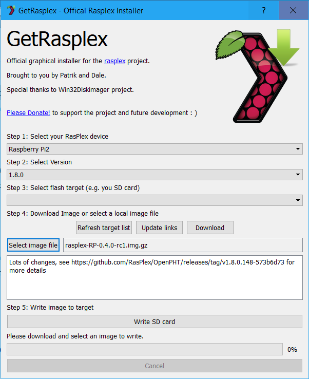 It said “choose Raspberry Pi 2 from the model number and version 1.6.2 (or the latest version) from the RasPlex.” So that is what I did.