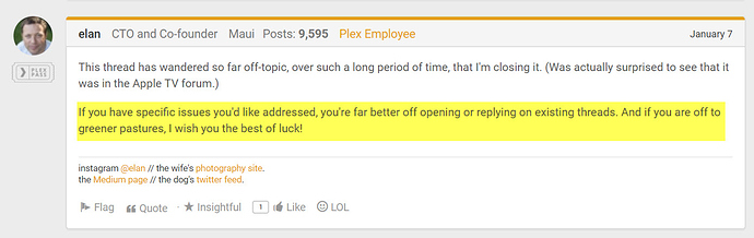 Is it not your costumers right if your product has bugs to demand that they are getting fixed? Telling us ones problems arent importent enough? Not even getting a feedback? After all you get money for your products features you advertise! It cant be that a Plex Employee, its CTO etc … just ends a diskussion this way. Closing a thread, end of talking over unpleasant things. Thats not the right way to treat your costumers. thats not the right way to treat anybody.