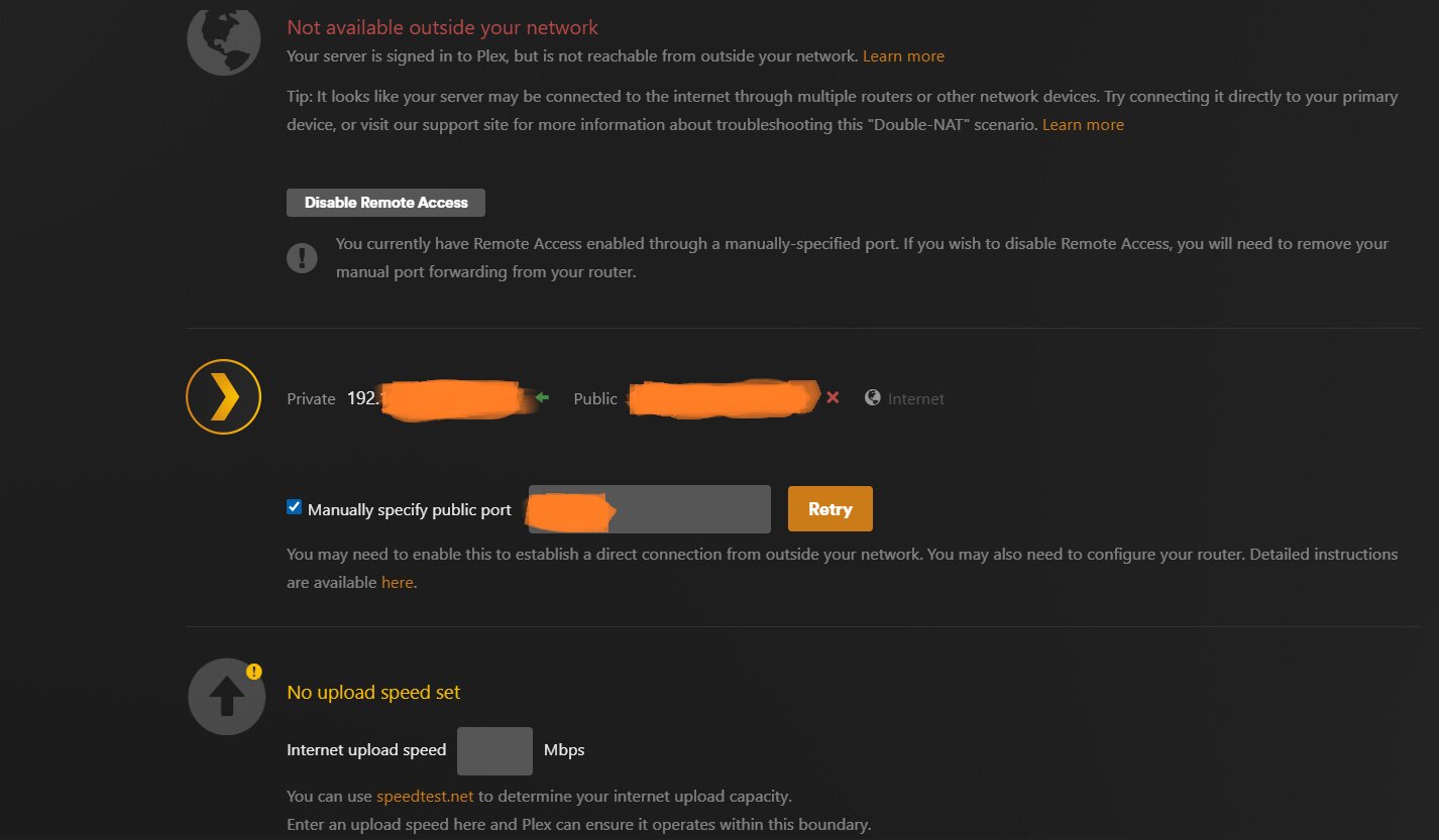 Plex seems to be suggesting a possible “Double-NAT” scenario, but this is not the case. Only one router and no other computer in the house.