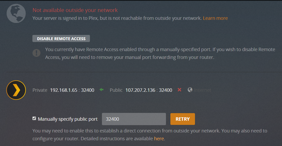 I set up remote access a few months ago and it worked flawlessly. fast forward a few weeks later and it no longer works correctlt. i an not directly connected to the server and thus the stream have terrible resolution via the relay servers. My port forwarding on my ISPs modem/router is configured to forward traffic from 32400 to 32400. Plex is configured to listen on 32400. I cannot see the issue, Any help? My Server’s name is Slave-1 (192.168.1.65)