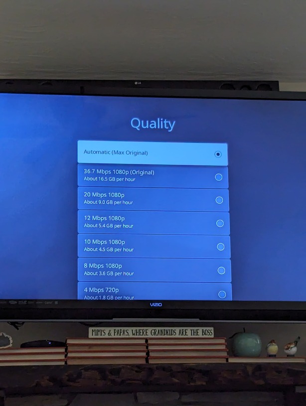 On the Roku side, I have gone under video settings and changed remote to “maximum”. However, when a movie or show is played and you click on playback settings "Automatic (Max 2mbps 720p) is what is selected. If they want to watch with better quality they have to manually select to choose original quality on every single movie.