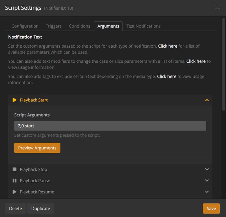 9 Go back to the browser tab that has tautulli in it and click on the “Arguments” tab. Click on “Playback Start” and enter the number of the device you want to stream to followed by a space and the word “start”.