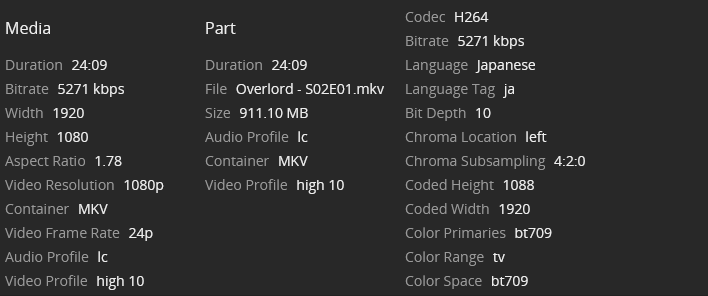 Now for the most part a Lot of the anime titles all are .mkv files. When looking at the file info Plex shows for ones that work vs ones that don’t, a lot of the details are all very similar but not exactly.