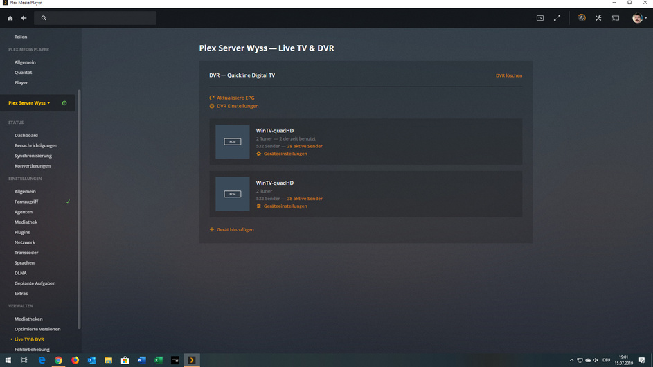 Alles gut solange bis ich das neuste Update von Plex Server mache dann ist wieder alles weg kein DVR und EPG und die TV Karten werden nicht mehr gefunden, erst nach einer erneuten Installation der Alten Version ist wieder alles da.