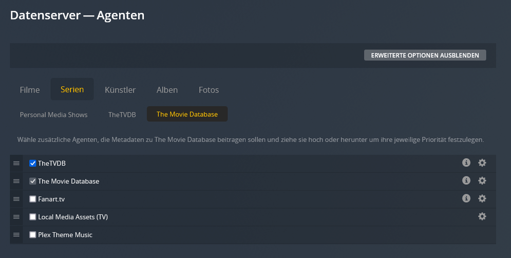 Die Server-weiten Agenten-Einstellungen greifen nur für die veralteten Agenten. Die Konfiguration für den Plex TV Series-Agenten erfolgt in den einzelnen Mediatheken (unter Erweitert).