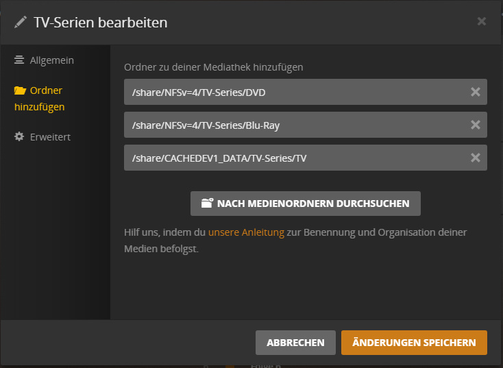 Was die Verzeichnisfreigabe im Plex angeht habe ich folgende Ordner genommen.