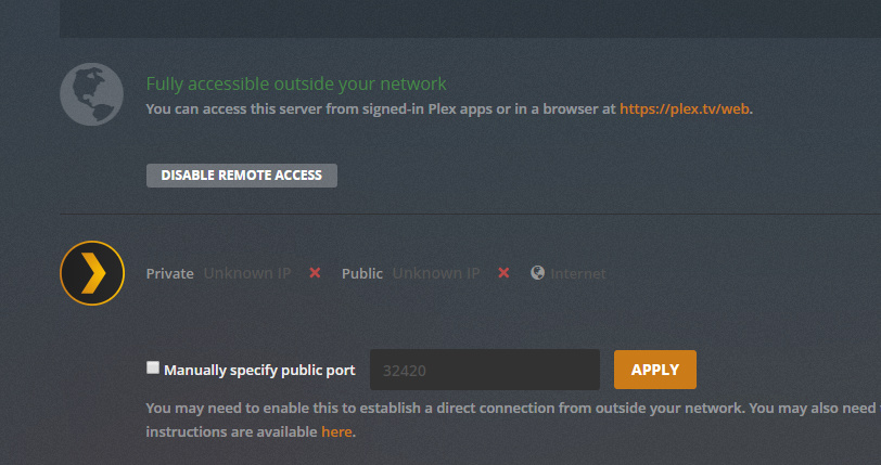 3) i can access my server via telnet and see that the service is running and plex is up.