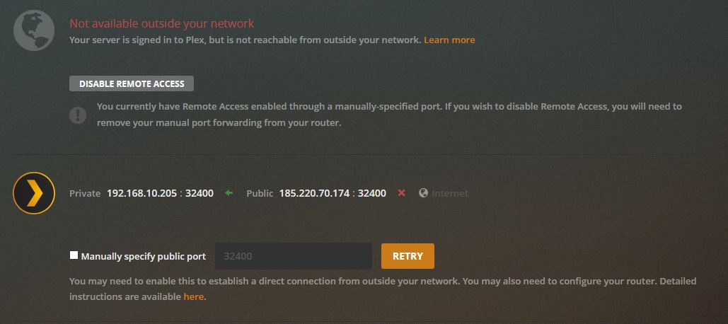 Whenever I press retry, often it shortly is accessible but not to far there after it mentions yet again " not available outside your network" after multiple updates restarts refreshes i come here to hope for some support in this matter. Lifetime Plex-pass holder.