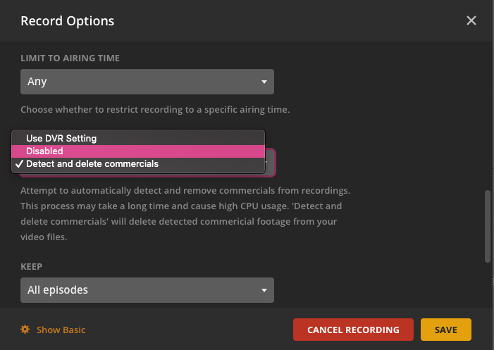 The commercial skipper is working but I am unable to select either “Disabled” and the new “Detect Commercials Skip” Of note, when I selected the new commercials skip, it did save but after the recordings finished the files simply disappeared. Not long after, the Plex server totally crashed. Now it is the same as the bug as I reported earlier, I’m unable to choose anything but what is set in the default DVR settings.