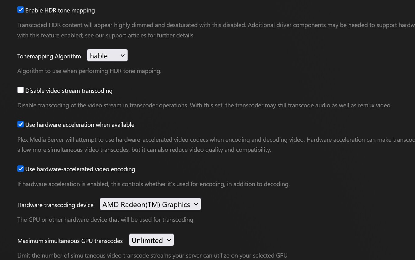 that was the case a while ago but plex has since updated the ffmpeg engine to the upstreamed version some 2-3 versions ago which supports amd’s vce for transcoding and HDR tonemapping. The settings and a list of tonemapping algorithms are there to choose from. I know it works for me as I see it whenever someone streams remotely.