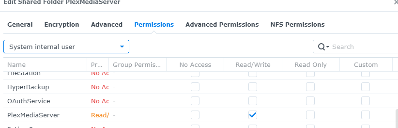 I went to the NAS and clicked on Shared Folder. I manage 2 folder sets - A) Plex Media - where are my media is stored. B) PlexMediaServer - The Plex Server.