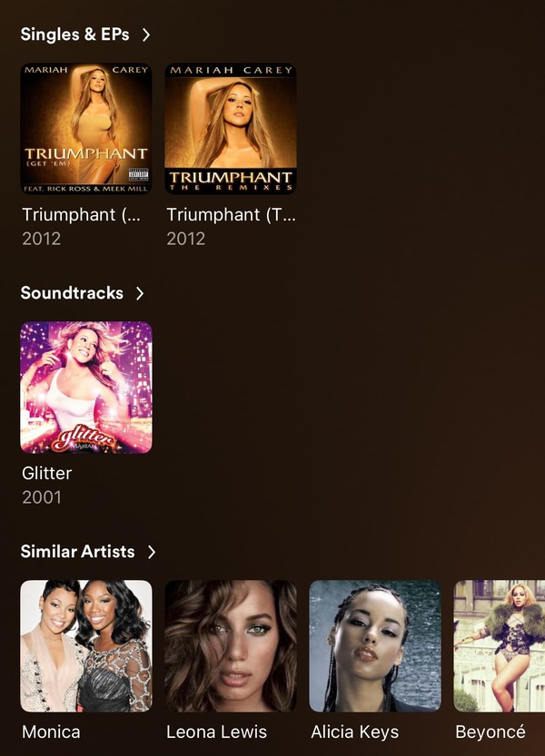 Ok so i double check on Web Ui its showing now but for plex desktop Version 1.97.2.190-ca5000d0 its not. I checked another artists it shows single but for Mariah Carey its not. Thats weird there not as they do for mobile. i dont know if it helps but i included my logs