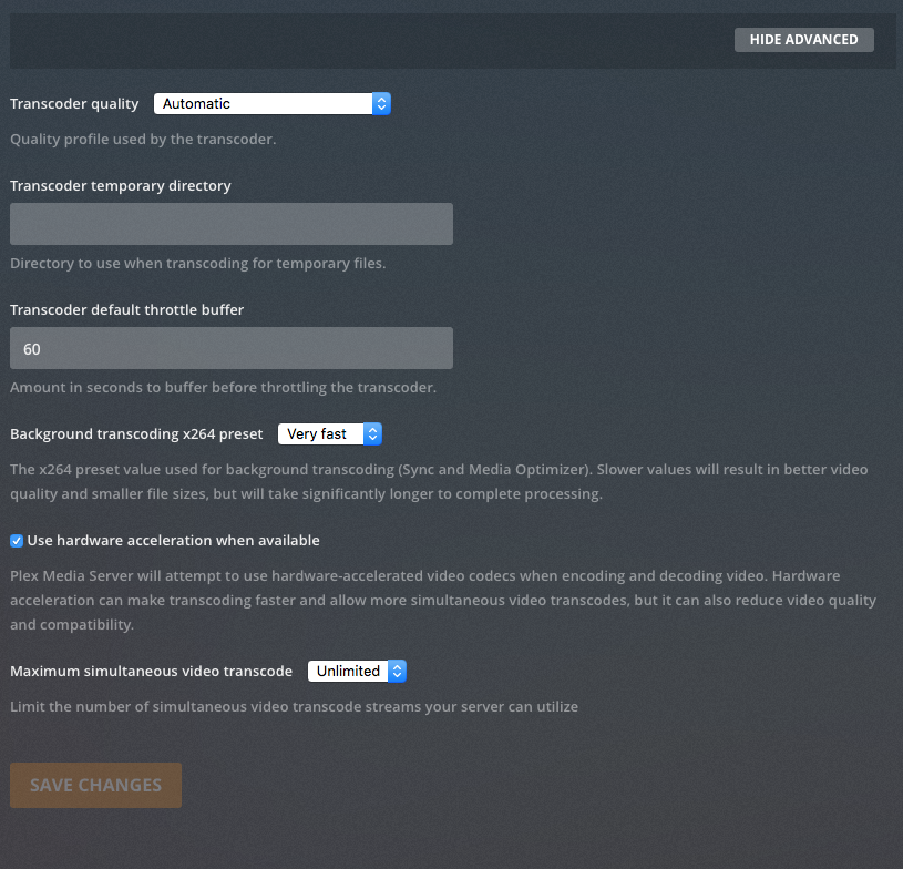 My hope was to use linux, and take advantage of hardware transcoding, but unfortunately I have run into some trouble. I installed Ubuntu 16.04 LTS server and plex, but the plex server setup UI does not show the Hardware Transcode option, and transcoding is happening on the CPU. Looking in the logs I see: