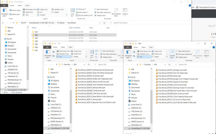 So funny thing. I moved all the seasons out of the S## folders and put them into the True Blood parent folder, ran a rescan on them. Season 2 still shows just find and when i look at the Get Info on those episodes, it is showing they were moved. I went through renaming Season 1 episodes and it wouldn’t let me rename 2 of them as it said they were being used by Plex transcoder.exe so I just went about and renamed the ones I could. After the scan was complete, nothing has changed. I shut down the server and brought it back up and ran another scan, still not showing the other episodes even though 2 of those were seen by the transcoder?