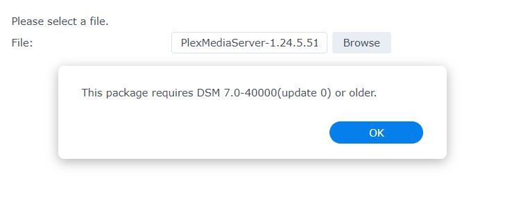 This is a fresh install of the latest Plex software for Synology (just downloaded the 64 bit version from the website). PlexMediaServer-1.24.5.5173-8dcc73a59-x86_64_DSM7.spk