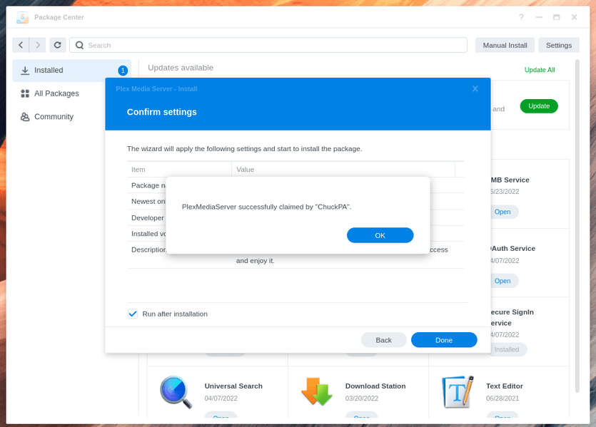 – Installer will show success or failure. Success will confirm using your Plex account username when done.