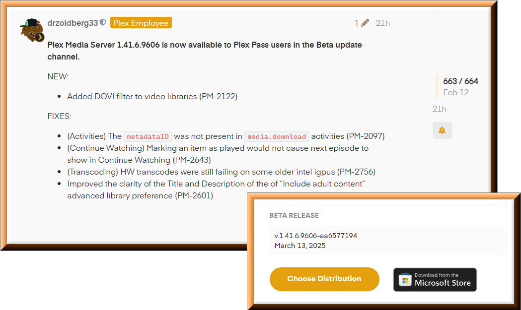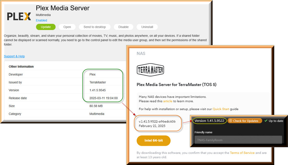 When I log into my PMS console, it tells me that 1.41.5.9522 is the latest PMS version. However, when I log into my TerraMaster console, it tells me that a newer version is available, 1.41.5.9545. When I go to the Plex website, there is no mention of version 1.41.5.9545.