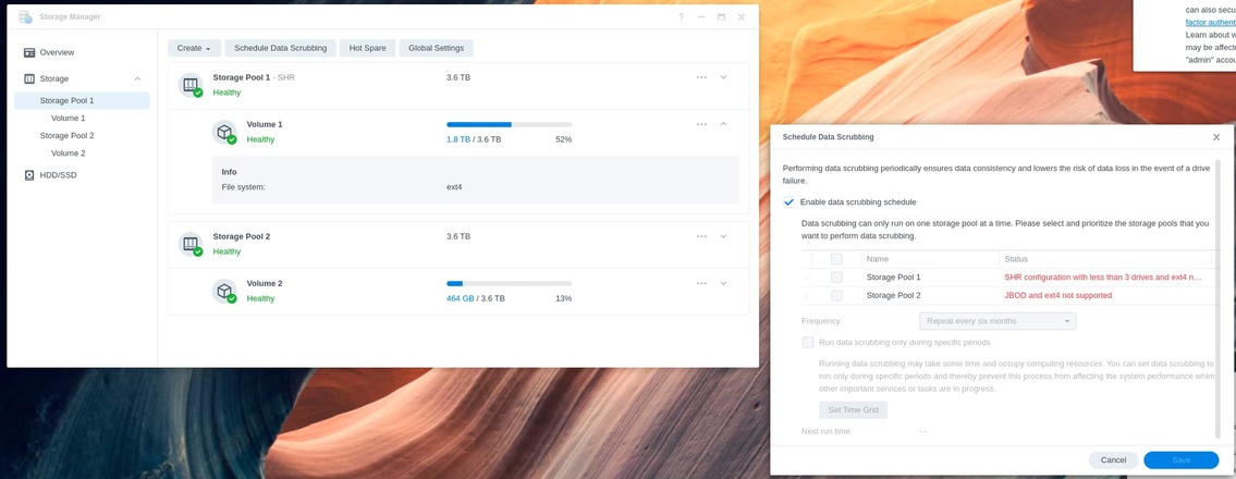 First, you did not need to convert to BTRFS for scrubbing. DSM has provided volume scrubbing for all volumes since DSM 4 (ext3/ext4).