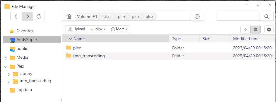 In the User directory, it creates a plex and tmp_transcoding folder, but if you open the plex folder, you just see another plex and tmp_transcoding folder like its just a referential link back to itself. It goes on and on if you keep opening the plex folder.
