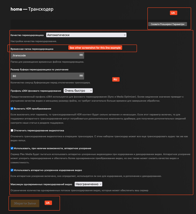 @anon18523487 can you please help me with this or point me to someone, who can help? I already finished the translation for web-player and moved to plex-media-server, but some strange things are going on. See two screenshots I assigned to this reply. On the first one you can see Transcoder configuration page. Only few words are Ukrainian - the rest of the text on this page is russian. I checked the translation for “Transcoder temporary directory” line - and it is correct on transifex.com (see the second screenshot) and was added 6 years ago. Why Transcoder page uses wrong translation? And not only Transcoder, many others as well (Network settings, etc). Could it happen that wrong resources were used during the build process? Even if there is no Ukrainian translation for some elements, why russian, why not English? Need to fix this ASAP, I’m ready to help.