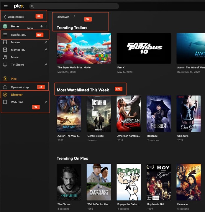 There is a total mess in the Ukrainian localization of Plex web interface. This is a mix of Ukrainian, russian, and English phrases and should be fixed. If you have no resources for this - I believe there is a solid Ukrainian community that can help with this. My post is not the first regarding this topic. This one was closed without any response @ vlad220978