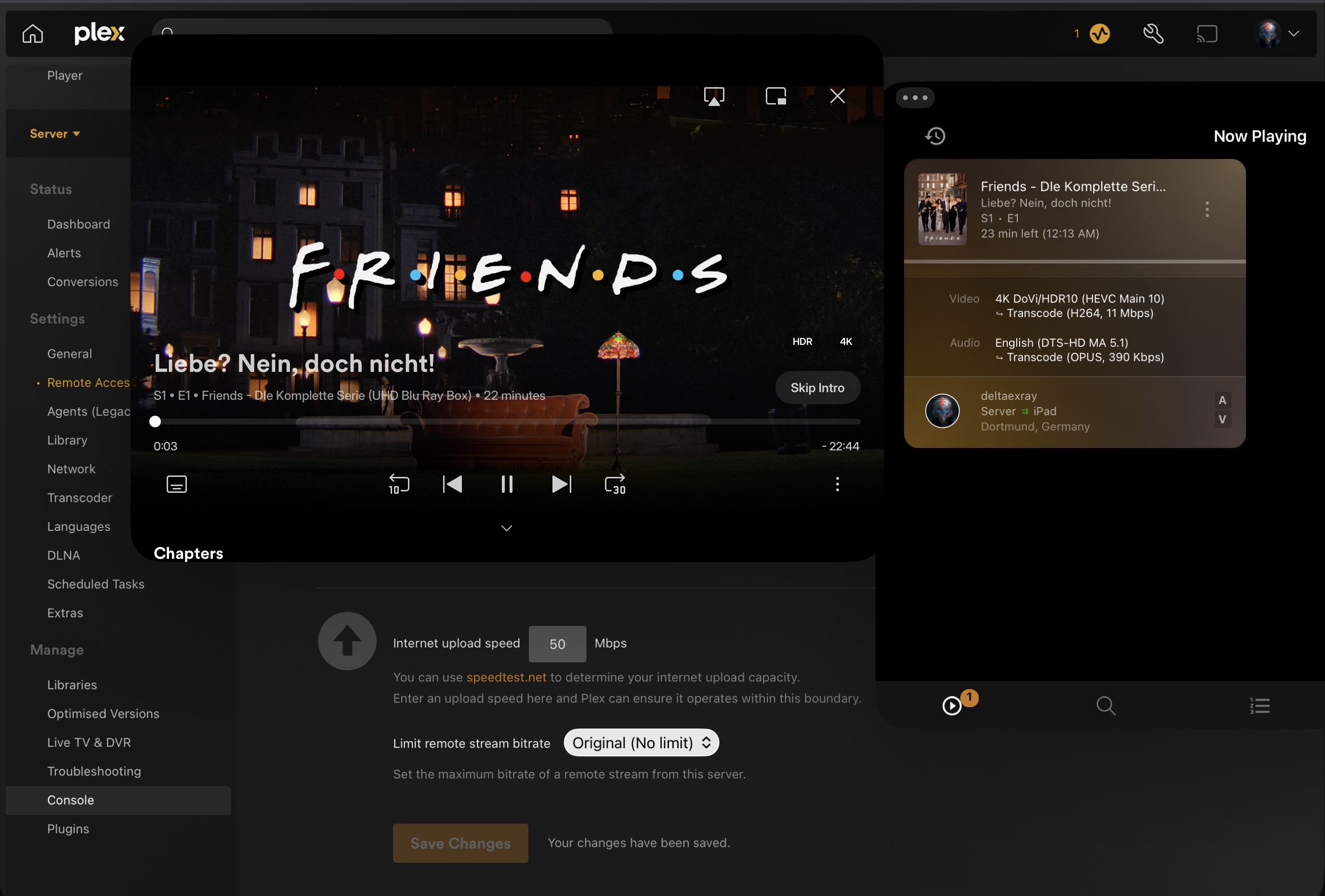 I have recently bought Friends in the UHD Blu Ray Version, which includes Dolby Vision HDR. Bitrate is around 47,5 mbit/s according to Mediainfo and Plex itself and for the in Home streaming that‘s no issue at all, Dolby Vision works, Sounds works both on the Apple TV 4K 3rd Gen without any issue. Same goes for the iPad Pro 13 M4, plays it back without issues, both Audio and Video are Direct Streams since the iPad and the Apple TV can support that. So far so good