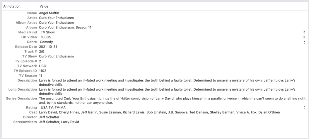 This is all in spite of the actual file metadata explicitly having the Media Kind set to TV Show. For example, the first three episodes of Season 11 of Curb Your Enthusiasm have this issue.
