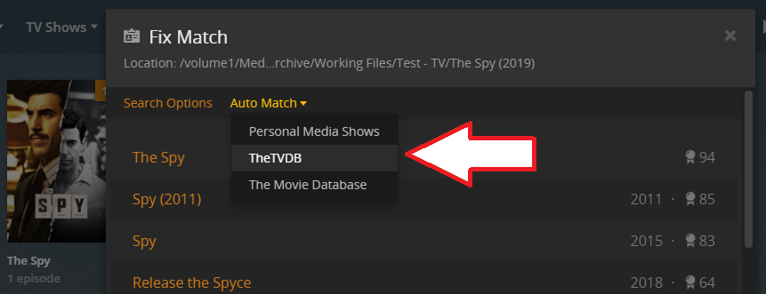 For me the Auto Match only works, when I’m looking for the German entry on TVDB. When trying to look for the English metadata, Plex is somehow matching “The Spy (2019)” to “Spy (2011)”