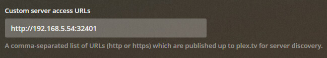 For my setup (I’m using port 32401 which passes to port 32400 in the container) I need to add the following otherwise the docker container only publishes it’s internal docker IP (and is unaware of my mapping from 32401 → 32400):