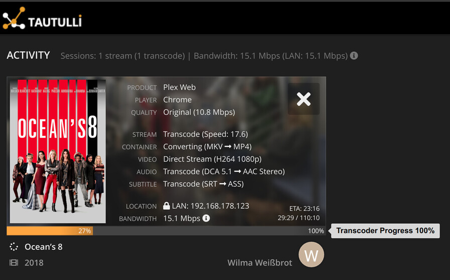 Network load should not be a problem as it is gigabit lan while the movie bandwidth is 15 Mbps only. And currently nothing happens on the LAN besides that stream. Server load should also not be a problem since it used to handle 4 simultaneous 1080p transcoding sessions without problems. Here it is 1 stream only with video direct play. Audio and subs are transcoded. Tautulli shows transcoder progress 100% / transcoding speed 17.