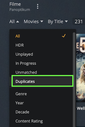 Thk u sirs 4 replies. I was able to find the duplicate by viewing the PMS server log. But I’ll familiarize myself with your method of Library filtering for future reference. Although I don’t recall seeing in the interface a “Duplicates” link, since that was the first thing I looked for when I no longer saw the Blue circle on the Posters. But I’ll check again for the Duplicates link.