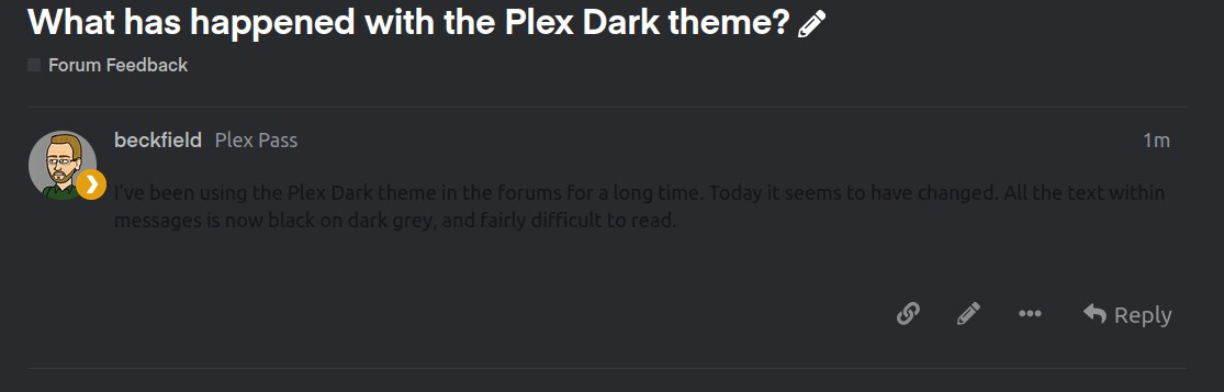 I’ve been using the Plex Dark theme in the forums for a long time. Today it seems to have changed. All the text within messages is now black on dark grey, and fairly difficult to read.