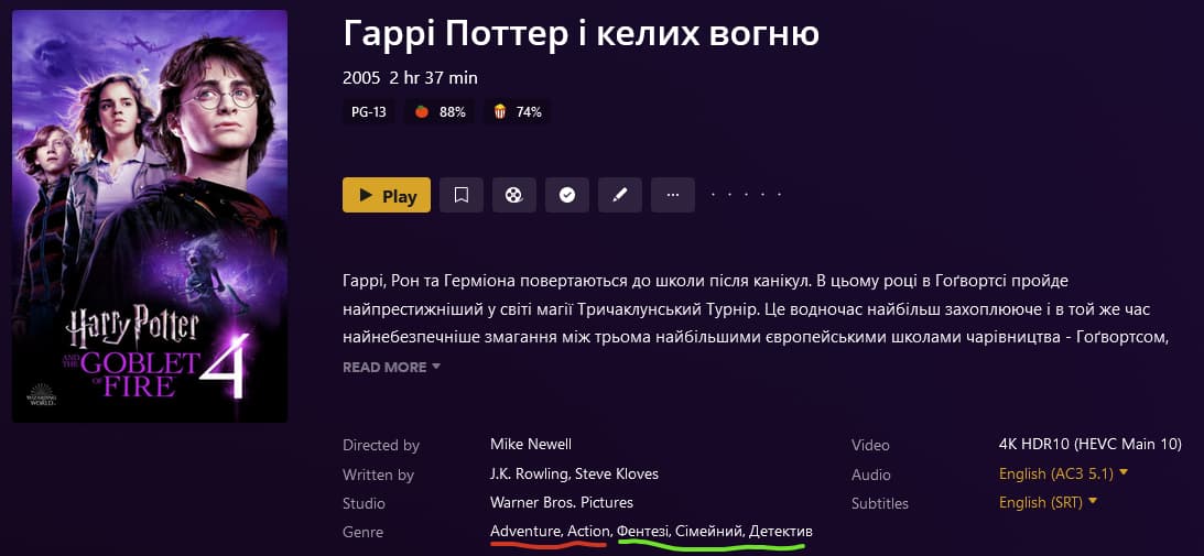 You can take any of Harry Potter movies as an example. All of them are Adventure genre which is not translated.