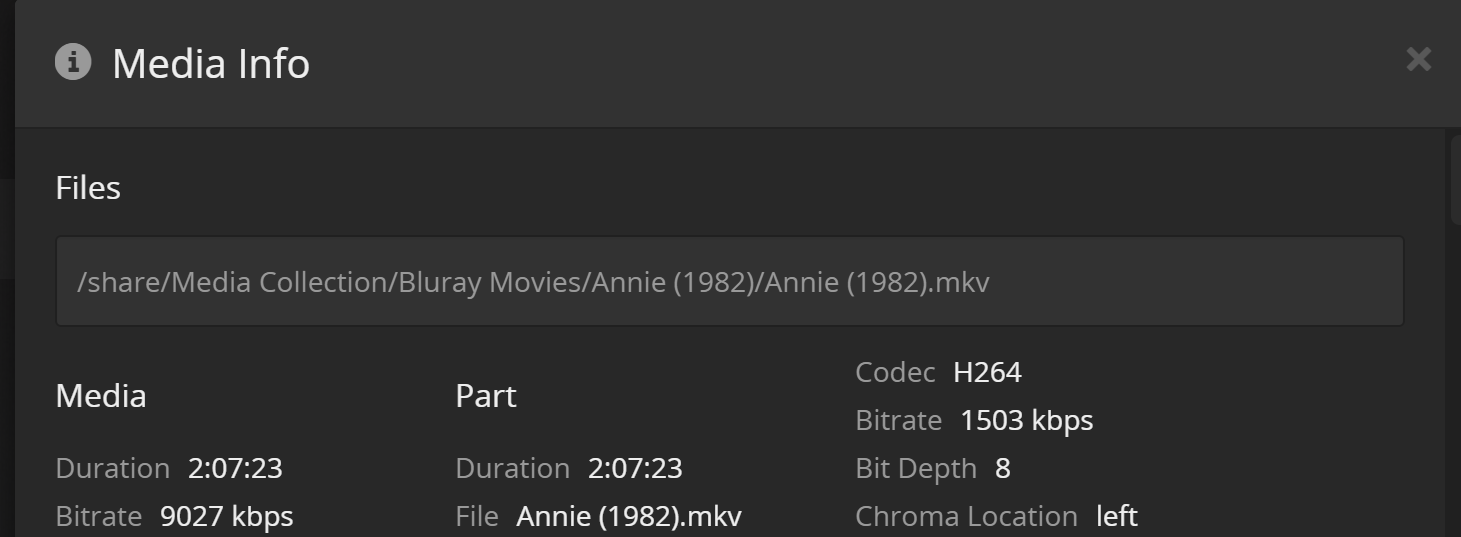 If you go into the settings for a movie or individual show episode what does it show in the Media Info box? Should be something roughly like this: