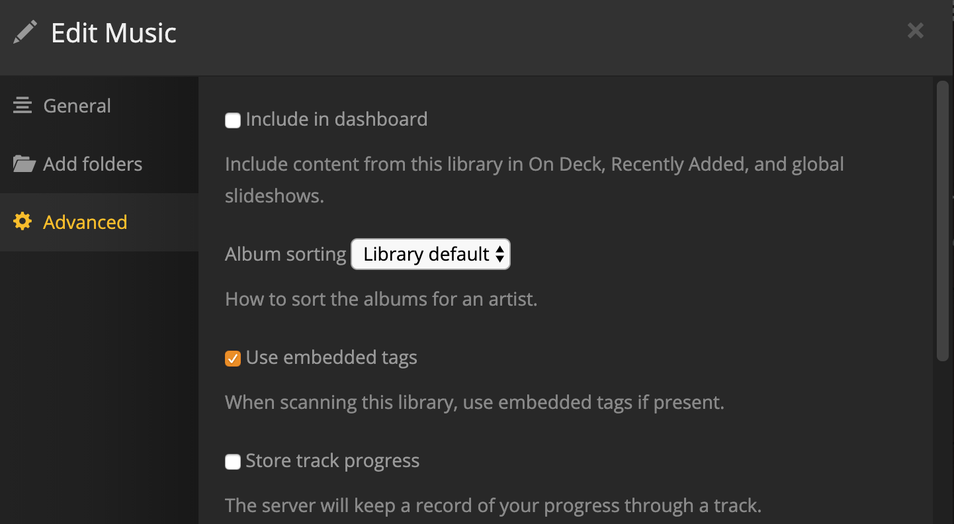 From what you are describing, I assume that your default metadata agent for this library is still either âlast.fmâ or âPlex Musicâ. Edit your music library, go to the Advanced tab and set Agent to âPersonal Mediaâ.