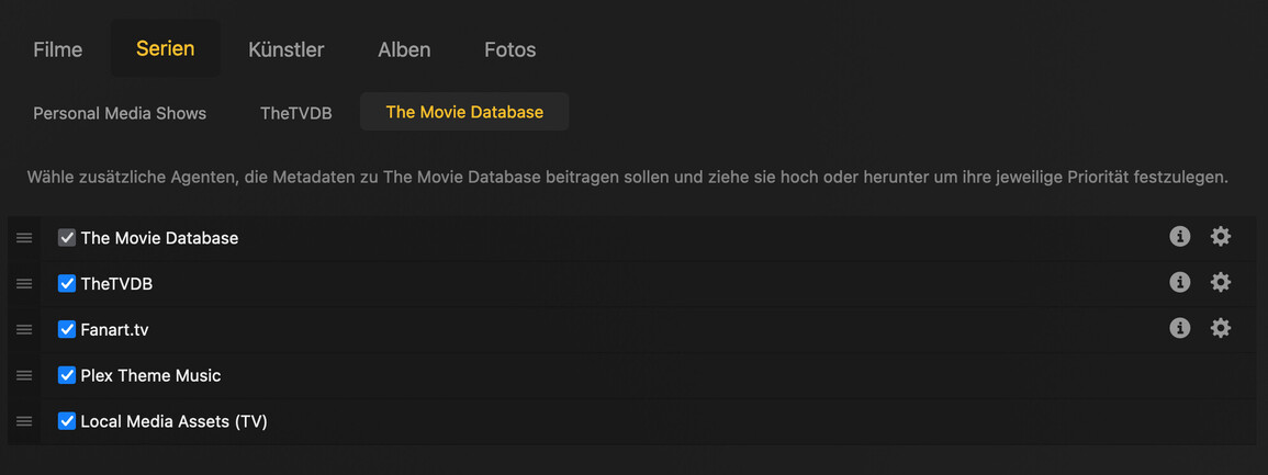In den Einstellungen der Serie steht alles auf Standard, die Einstellungen der Mediathek zeigen auf TheTVDB (bei Reihenfolge) und “{x} Bevorzuge Poster in Sprache der Mediathek” . Scanner/Agent = Plex TV Serries. “Benutze lokale Assets/Metadaten” ist jeweils deaktiviert. Und waren es auch schon immer.