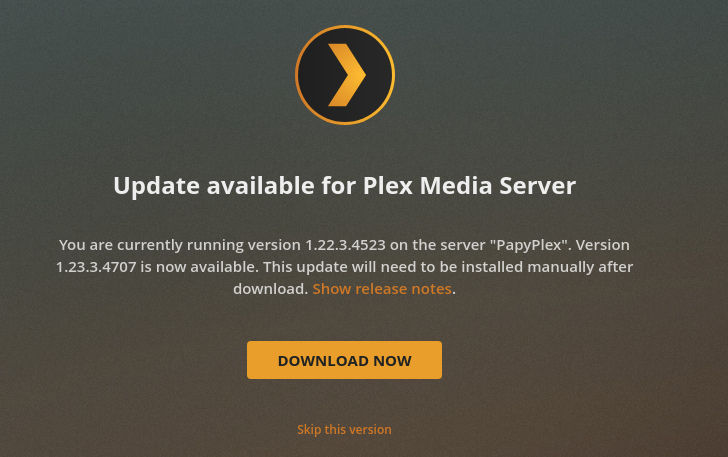 To test the arrow functionality I started my other PMS instance on a Windows machine. The arrow immediately appears next to the activity button and says “server update available.” As expected.