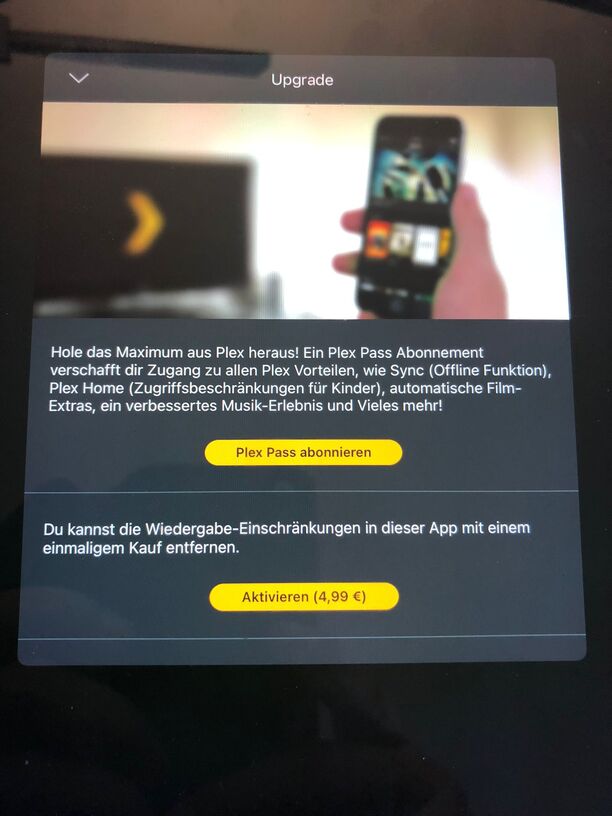 Für normale “Plex Freunde” gilt das ausdrücklich nicht. Die müssen entweder einen eigenen Plex Pass für ihr Benutzerkonto kaufen oder aber die App mit einer Einmalzahlung von ~5€ im App Store freischalten.
